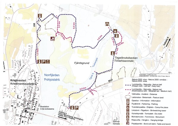 I Kristinestad kan du enkelt röra dig ute i naturen till fots, det finns ett flertal vandringsleder att välja mellan. Vid Bötombergets friluftsområde finns en rad olika vandringsleder och skidspår av varierande längd. I Skaftung finns en naturstig. Även vid Storholmen i Perus kan du ströva runt längs stigar. Närmast centrum finns Tegelbrukbackens-Norrfjärdens naturstig, motionsspåret vid Blåbärsskogen och Björnkärrsslingan.